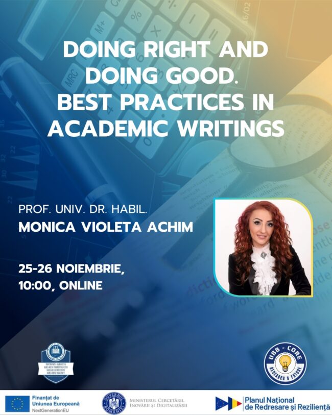 [vc_row][vc_column width="1/2"][vc_column_text]📢 În perioada 25–26 noiembrie 2025, are loc workshopul online „Doing Right and Doing Good. Best Practices in Academic Writings”, susținut de Prof. univ. dr. habil. Monica Violeta Achim.